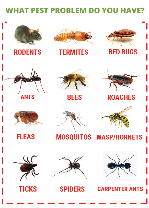 Common service includes ants, roaches, spiders, rodents, stinging insects, termites, bed bugs, mosquitoes, ticks, and seasonal invaders.